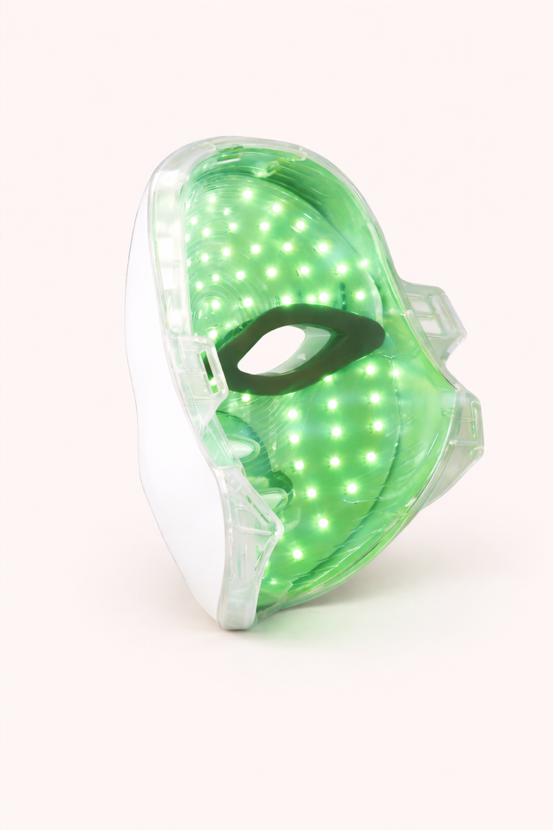 Grünlicht beruhigt die Haut und reduziert Pigmentflecken für einen gleichmäßigen Teint.
